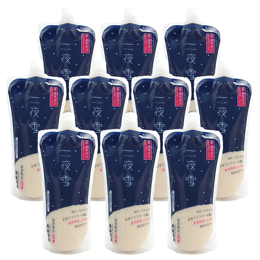 明治38年創業の老舗糀屋「片山商店」が丁寧に仕込んだ甘酒「糀あまざけ一夜雪(ひとよゆき)」。米の品質や特徴、保存方法、炊き方に至るまでの幅広い知識を持つ「五ツ星お米マイスター」の店主が厳選した新潟県産コシヒカリを100%使用し、手間を惜しまず大切に育てられた糀から作られています。砂糖などの甘味料や添加物は一切不使用!糀のやさしい甘さが味わえる大人気商品です。薄めずにそのまま飲むことができ、ノンアルコールなので幅広い世代の方々に気軽にお楽しみいただけます。