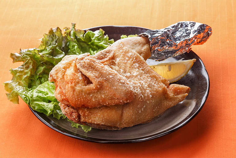 鶏の「半身揚げ」をまるごと豪快に揚げたジャンボ唐揚げ。パリッとした皮とやわらかくジューシーな鶏肉は、一度食べたら忘れられません!