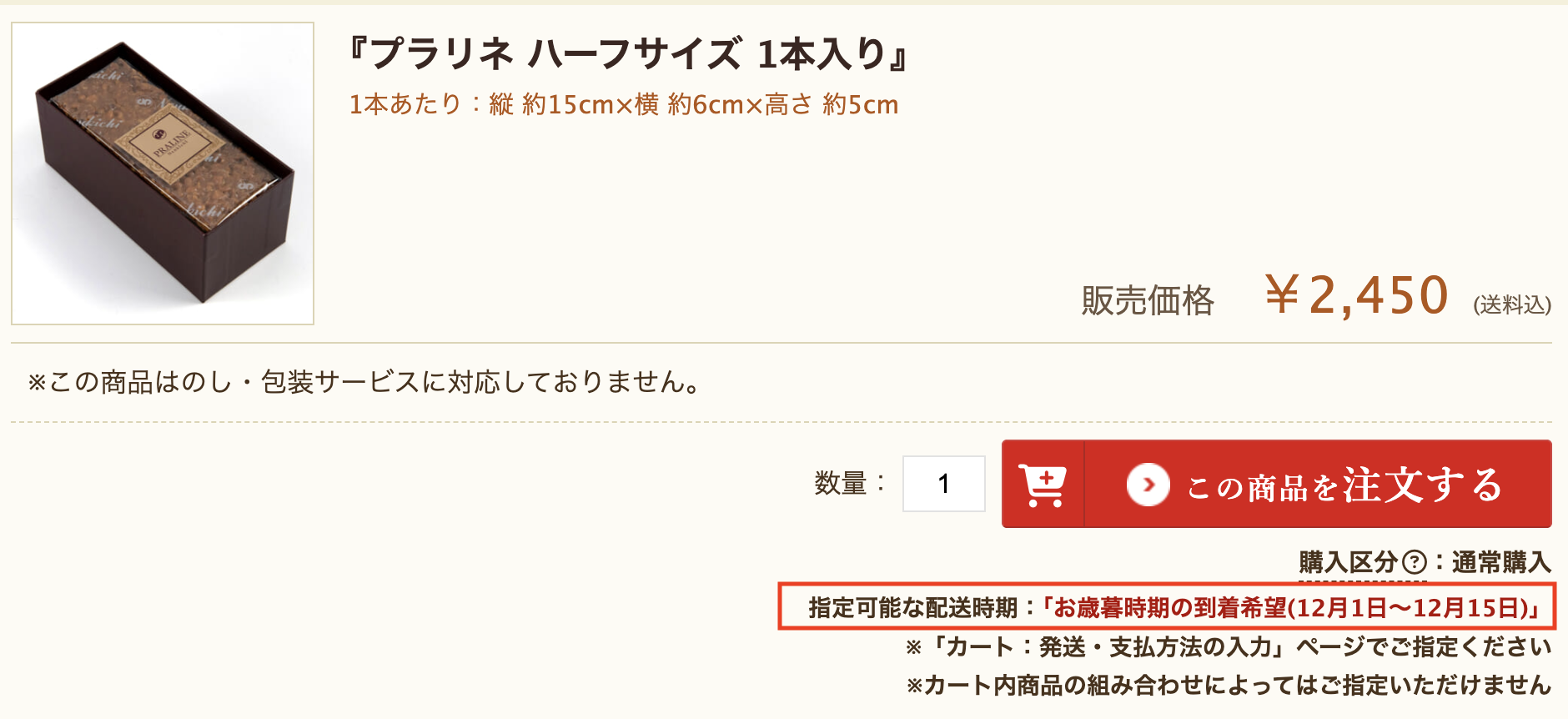 「指定可能な配送時期:「お歳暮時期の到着希望(12月1日~12月15日)」」と表示されます。