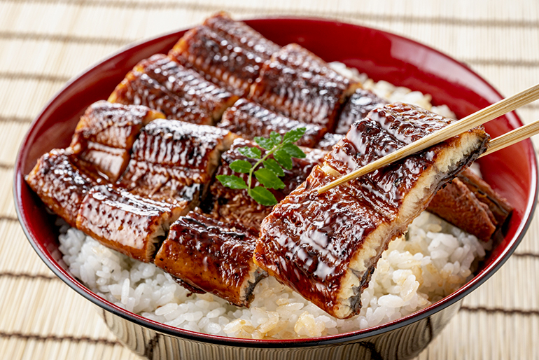 出来立てのおいしさを冷凍にして届けてくれる「山重のお惣菜詰め合わせ」。「うなぎ蒲焼」を湯煎で10分ほど温め、炊き立てのご飯にのせれば、あっという間に贅沢な「うなぎの蒲焼丼」の完成~。醤油の香ばしい香りが食欲をそそります。