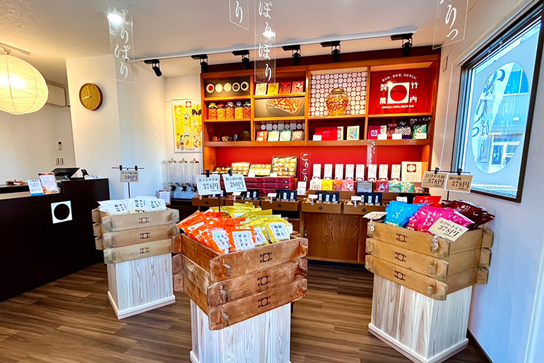 皐月堂を運営するのは、1946年創業の米菓会社「竹内製菓」。江戸時代から続く家紋「餅紋(もちもん)」をシンボルとし、創業以来「あられ、おかき、ひとすじに」をモットーに、米菓を作り続けている。特に、代表商品の「柿の種」は、老若男女問わず、地元民を中心に多くの方に愛されている。竹内製菓の米菓製造のこだわりは、「もち米いのち」と「全員職人宣言」の2つ。「もち米いのち」は、その名の通り米菓に使うもち米に人一倍こだわるということ。竹内製菓では、精米したての新鮮なもち米にこだわり、仕入れたらなるべく早く使い切るように心がけている。「全員職人宣言」は、各工程に携わるスタッフ全員が「職人である」という高い志と技術を守り続けるということ。「原材料となるもち生地は、その日の気温・湿度などで状態が変わりやすいため、マニュアル化が難しい。五感に頼りながら、品質の安定化に努めています」と、工場長の羽鳥さんは語る。素材・製法にこだわるからこそ、「いつ食べても美味しい米菓」を作り出せるのだ。