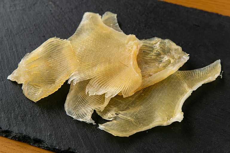 焼いたえいひれを使用することで、サクサクとした食感のおつまみ。赤唐辛子をまぶして、ピリ辛な味わいに仕上げました。これはビールが進みます!