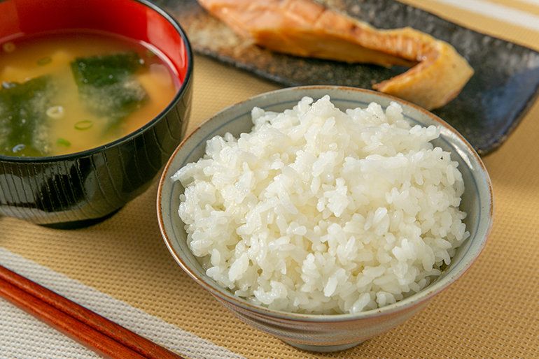 はざかけ作業は、のぞみふぁーむの皆さんと地元農家だけでは人手が足らないらしく、地域お越し協力隊の力も借りて、総動員で行っているそうです。今回は、炊きたての白ご飯をお味噌汁や焼き鮭と一緒に試食します。