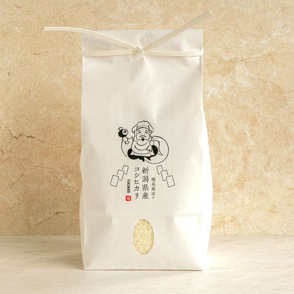 阿賀野川に流れる清らかな水で育った、福成商店のコシヒカリ。みずみずしくやさしい甘みのお米を食べて、「福」を感じてみてください。「大黒様」をあしらった米袋は、お祝いの品にもぴったりです!