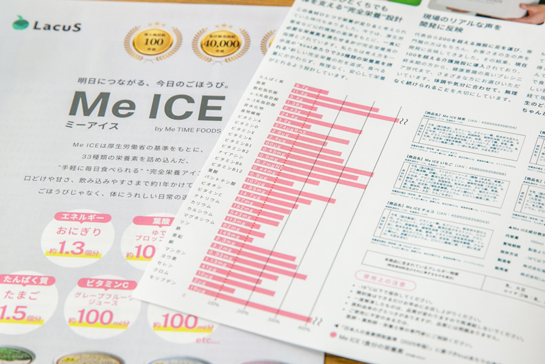 取材担当:加部「Me ICE(ミーアイス)」は、ビタミン・ミネラル・食物繊維など、33種類の栄養素をぎゅっと詰め込んだアイス。毎日の食事だけでは不足しがちな栄養の補助として、おやつやデザートにお召し上がりください!