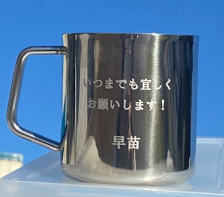 出店から一周年を記念して、12月と1月に発注を頂いた名入れステンレスマグカップに、16文字以内のメッセージを通常価格で印字のできる「メッセージマグカップキャンペーン」を致します。