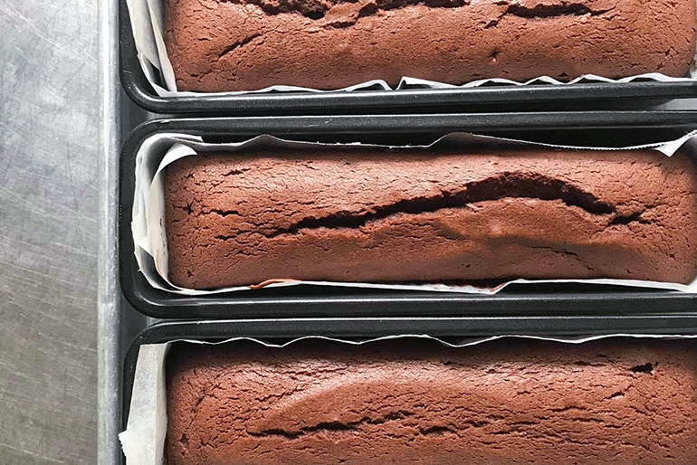 酒粕ショコラテリーヌは、とろけるような「なめらか食感」が自慢。その秘密は、生地の焼き方にあります。型に入れた生地をお湯を張った鉄板の上で、低温でじっくりと焼き上げるのがポイント。こうすることで、蒸し焼きのような状態になり、しっとりとした生地に仕上がります。