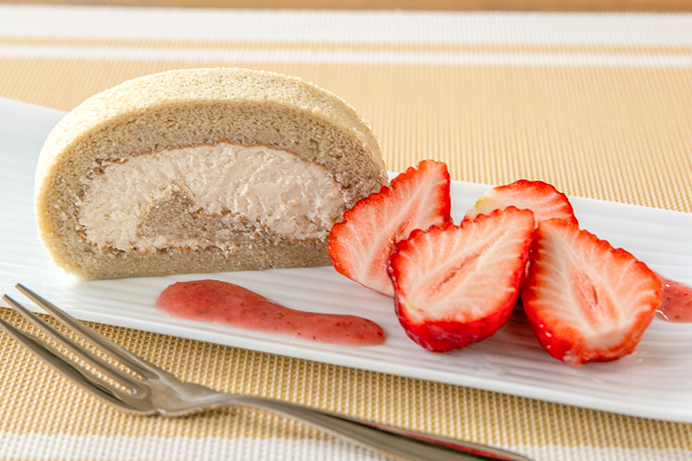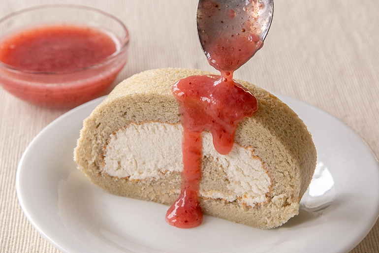 フレッシュな「越後姫ソース」 ふんわりとした食感とやさしい甘さのロールケーキ