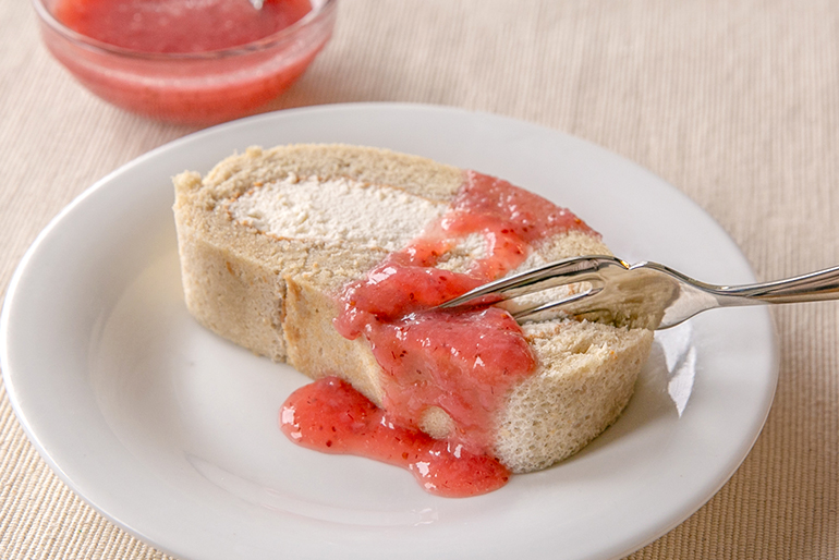 可愛らしく盛り付けできました!きびさとうの色味が活きた茶色いスポンジに、ピンク色の越後姫ソースが映えますね~。フォークを入れると、弾力のある感触です。ぱくり……。う~ん、しっとり、ふんわりとした食感!とても軽い口当たりですね。そして、越後姫ソースの甘酸っぱさの中に、ほんのりと感じる米粉の甘みがやさしい~。シンプルなロールケーキのため、いろいろなトッピングで楽しめるのもうれしいですね!
