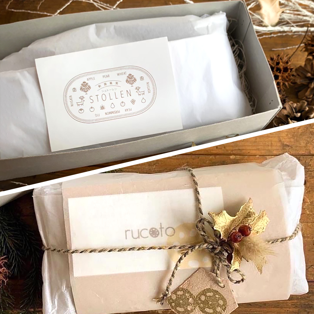 「旬果甘味店 ルコト」が手がけるシュトーレン。和梨・いちじく・りんご・ル レクチェなど、地元で収穫される果物を使った自家製ドライフルーツが自慢です。クリスマスシーズンのギフトにも喜ばれますよ!