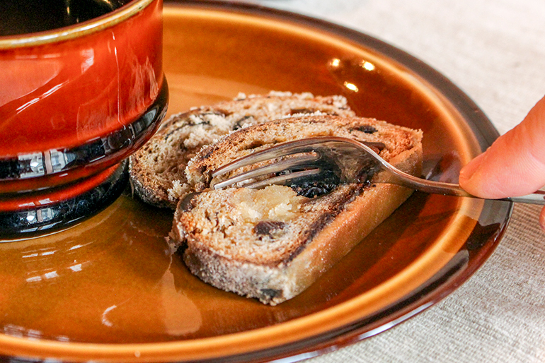 シュトーレンの本場・ドイツでは、クリスマスの約1ヶ月から少しずつ食べる風習があります。中央からカットして、切り口を合わせておくと風味を逃さずに保存できますよ。コーヒーを用意して、いただきま~す。