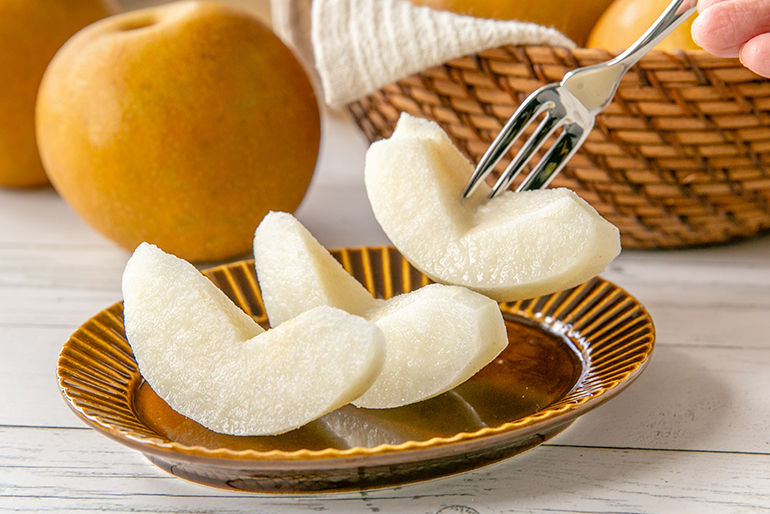 秋に旬を迎える「あきづき」は、その名の通り月のように丸く、大玉で食べごたえ抜群。緻密で柔らかい果肉をかじれば、甘くてジューシーな果汁が溢れ出しますよ。