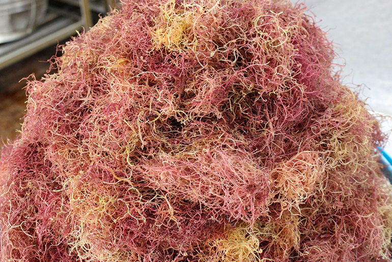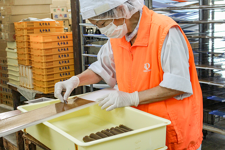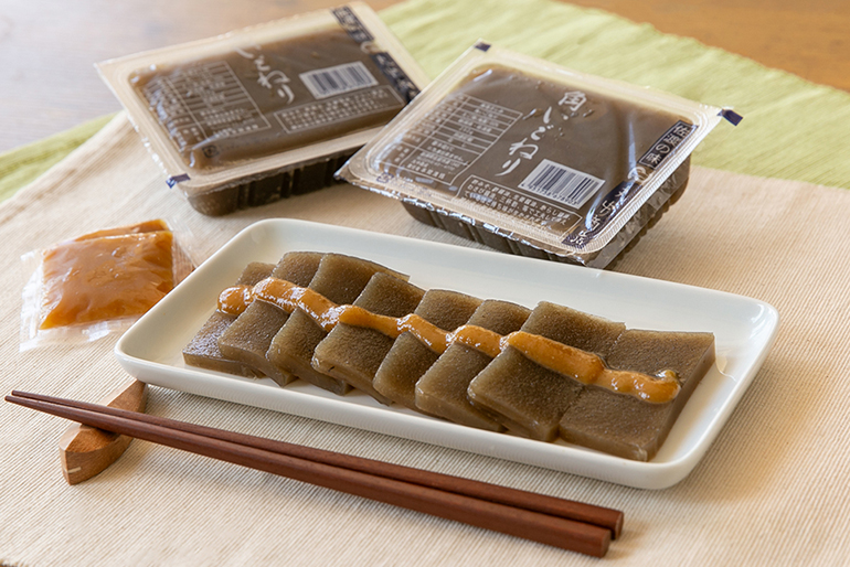 丸中商店の看板商品は、佐渡の郷土食として親しまれる「いごねり」。これは、日本海側で採れる「えご草」という海藻を煮溶かし、よく練り、冷やし固めたもの。佐渡では、薄く伸ばして固めたものをくるくると巻いた「巻いごねり」が主流だ。「えご草は、縄文・弥生時代から食べられていたと言われています。当時は、木の板などに伸ばしていたと思われます。諸説ありますが、佐渡の巻いごねりのルーツはここにあるんじゃないかな~」と、本間さんは楽しそうに語る。佐渡の巻いごねりは、古くから各家庭で手作りされ、島民の暮らしに深く根付いてきた。丸中商店では、そんな佐渡ならではの食文化を大切に受け継ぎ、次の世代へ伝えている。本間さんは、「昔おばあちゃんと一緒に買いに来ていたお孫さんが、大人になって買いに来てくれたりします。世代を超えて愛されているのは、嬉しいことですね」と微笑む。