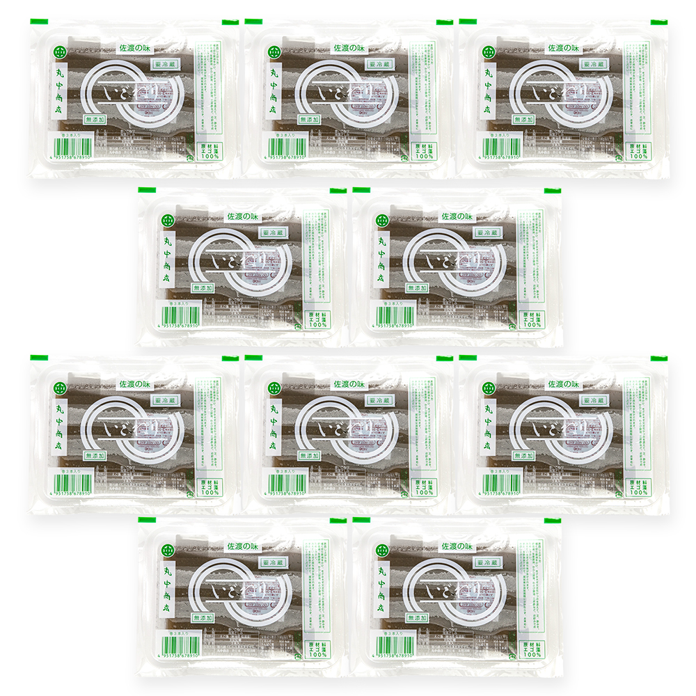 独自の食文化が根付く佐渡で、ソウルフードとして親しまれている「いごねり」。日本海側で採れる「えご草」という海藻を煮溶かし、よく練り、冷やし固めたものです。佐渡では、薄く伸ばして固めたものをくるくると巻いた「巻いごねり」が主流。今回は、70年以上いごねりを作り続けている老舗「丸中商店」のものをご紹介します。巻いてあるいごねりを広げ、ところてんのように細長くカットして食べるのが佐渡流です。刻みネギやしょうがなど、お好みの食材をトッピングしてお楽しみください!