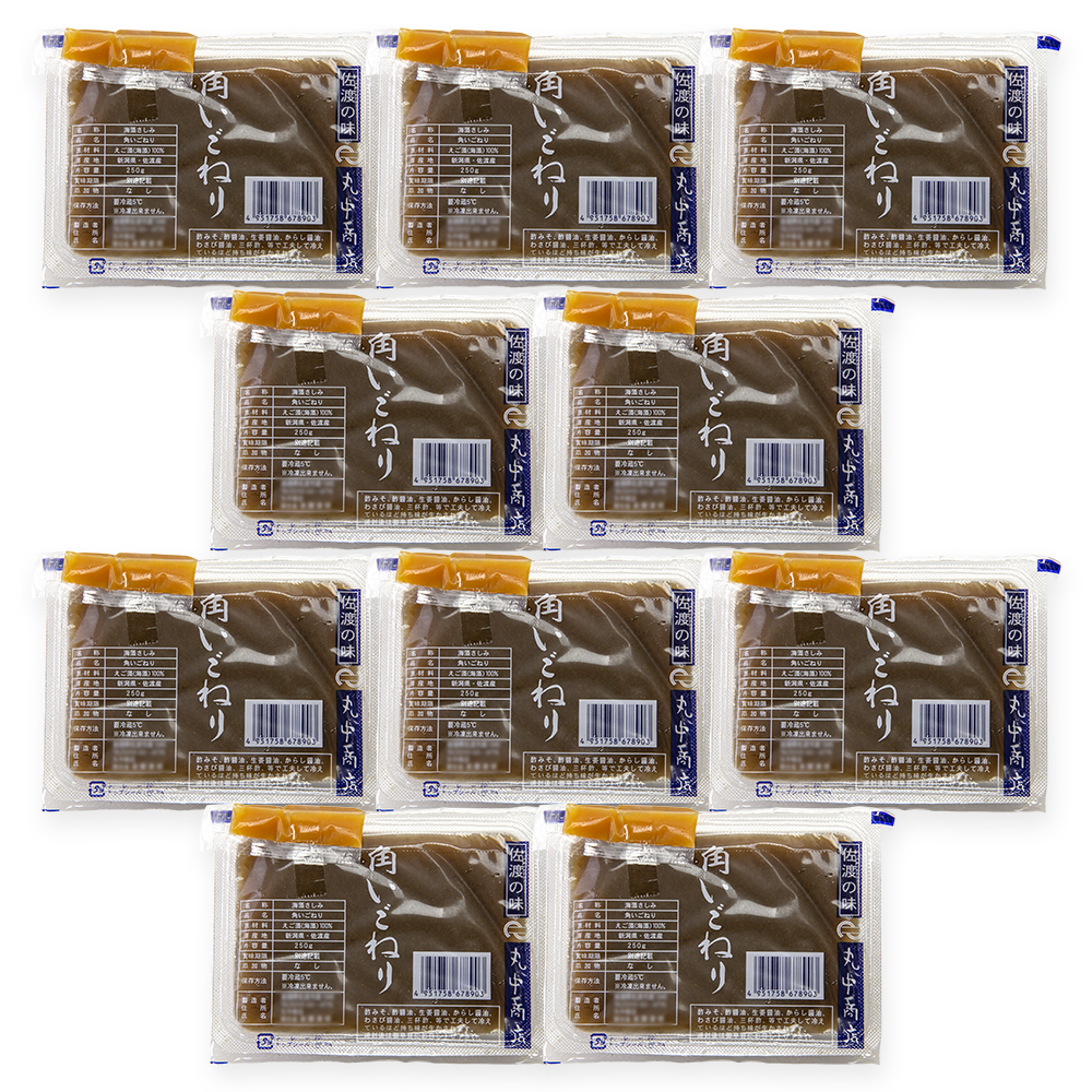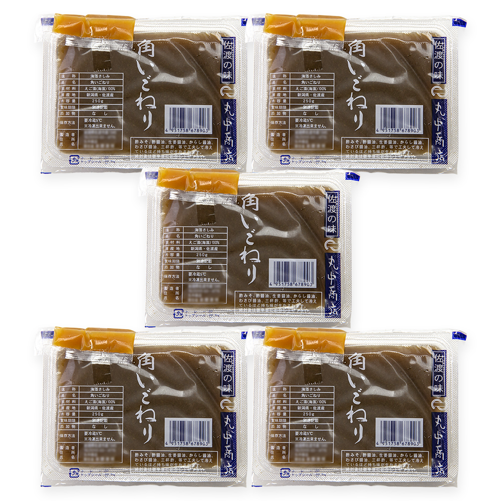 独自の食文化が根付く佐渡で、70年以上いごねりを作り続けている老舗「丸中商店」。いごねりとは、日本海側で採れる「えご草」という海藻を煮溶かし、よく練り、冷やし固めたものです。新潟本土では、長方形の型に流し込んで固めた「角いごねり」が親しまれています。今回は、本土で馴染みのある角いごねりに、酢味噌を付けてお届けします。