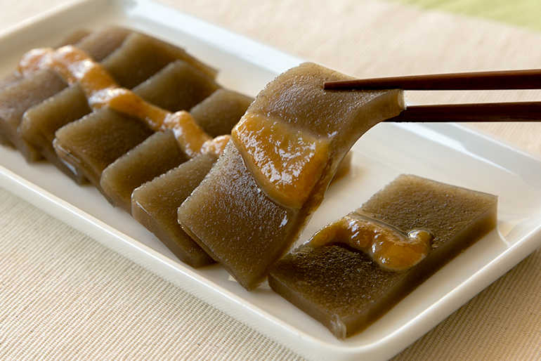 見た目はこんにゃくのようですが、ほんのりと磯の香りがしますね。ぱくり……。おお~、ツルツルとした口当たりで、もっちりとした食感!さっぱりとした味わいと磯の香りが、酢味噌とよく合いますね~。お酒のアテはもちろん、お茶請けにも良さそうです。