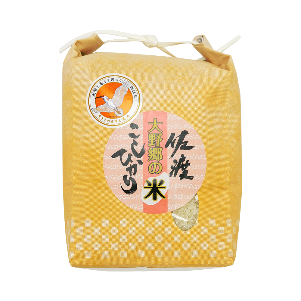 佐渡市新穂大野地区(大野郷)で育ったコシヒカリ。農薬や化学肥料の使用を慣行の5割以下に抑え、トキと共生しながら栽培した佐渡市の認証米です。炊き上がりの美しさや食味の良さが自慢!
