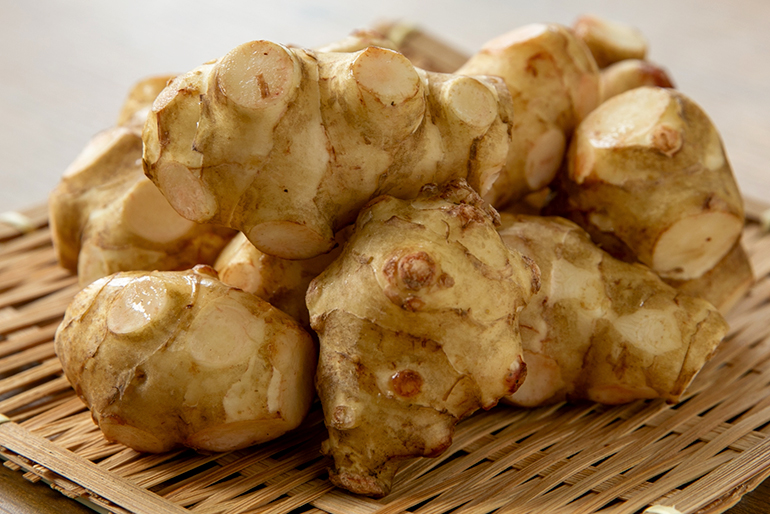 きく芋は、北アメリカ原産のキク科ヒマワリ属の多年草。草丈は1〜3mほどに成長し、秋には菊に似た黄色い花を咲かせます。食用とされるのは、「塊茎(かいけい)」と呼ばれる、地中深くで育つ肥大した茎の部分。生姜に似たゴツゴツとした見た目が特徴です。口に入れると、優しい甘さと、ごぼうに似た香りがほんのりと広がりますよ。水溶性食物繊維の一種「イヌリン」が含まれています。