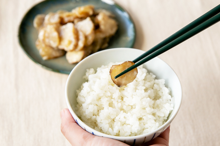 取材担当:渡邉百姓や本舗が、きく芋の栽培から加工までを行う「きく芋の粕漬け」。丁寧な手作業で一つ一つ作られています。さっそく、炊き立てのご飯と一緒に試食です!
