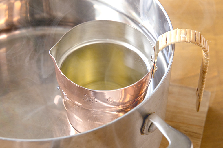 3. 沸騰したら火を止め、ちろりを鍋のふちに掛けるように入れて湯煎をします。
