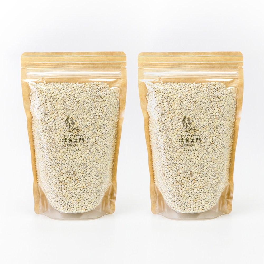 「むぎとお米と柿農家 伝右ェ門(でんねむ)」は、日本海に浮かぶ佐渡ヶ島の農家。ご紹介するのは、「はねうまもち」という新潟県生まれのもち麦。もちもち・ぷちぷちとした独特の食感が特徴です。一般的なもち麦に比べて水溶性食物繊維(βグルカン)の含有量が多く、食物繊維の量は「白米の約17倍」と言われています。