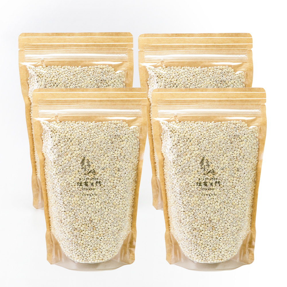 「むぎとお米と柿農家 伝右ェ門(でんねむ)」は、日本海に浮かぶ佐渡ヶ島の農家。ドンデン山の麓に位置する羽吉地区で、大麦の一種「もち麦(もち性大麦)」を栽培しています。ご紹介するのは、「はねうまもち」という新潟県生まれのもち麦。もちもち・ぷちぷちとした独特の食感が特徴です。一般的な「うるち大麦」に比べて水溶性食物繊維(β-グルカン)の含有量が多く、食物繊維の量は「白米の約17倍」と言われています。今回は、ギフト向けの個包装パックや、ご自宅向けの大容量パックなどを豊富にご用意しました。