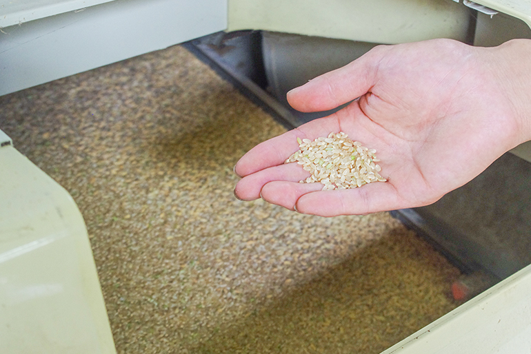 丁寧な作業と栽培方法で米を育てている、なんば農園。肥沃な土壌で、農薬や化学肥料の使用を抑えた栽培を実践する。有機質の肥料を使うことで、微生物が有機物を分解して肥沃な土壌を作っていく。また、ほ場ごとに、水の入りと抜けを細かく確認し、水管理を徹底。生育期には、糖分やミネラルなどの栄養分が濃縮された「糖蜜」を葉面に散布し、微生物の働きを助け、稲の光合成の力を高めている。「こういった作業をすることで、倒伏に強く粒張りの良いお米になり、食味も安定するんですよ」と、南波さん。また、収穫や乾燥、精米まで一貫して自分たちで管理をすることも、こだわりの一つだ。乾燥では極力低温でじっくり乾すことで、米が割れることや変色することを防いでいる。「この一歩一歩の作業の先に、『おいしい』の笑顔があると信じて、全ての作業に向き合っています」と、力強い眼差しで語る。