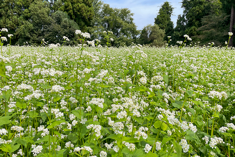 妻有工房かわきたでは、例年8月上旬に種をまき、10月下旬に収穫を行います。そば畑のある川治地区は、昼夜の寒暖差が大きい中山間地。付近には、川治川(かわじがわ)と羽根川(はねがわ)という2本の川が流れ、傾斜のついた河岸段丘が広がっています。「そばは、風通しと水はけの良い場所を好みます。この辺りは、そばの栽培にぴったりなんですよ」と、代表・遠田さん。さわやかな風が吹く畑で健やかに育つことで、香り高いそばに仕上がります。