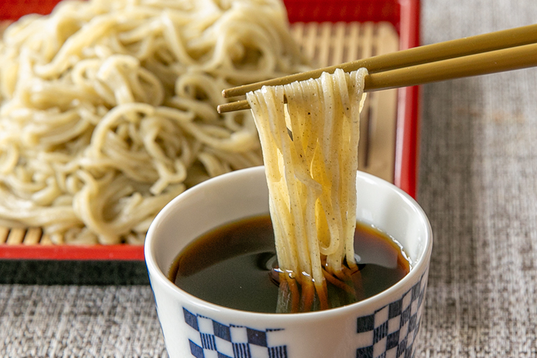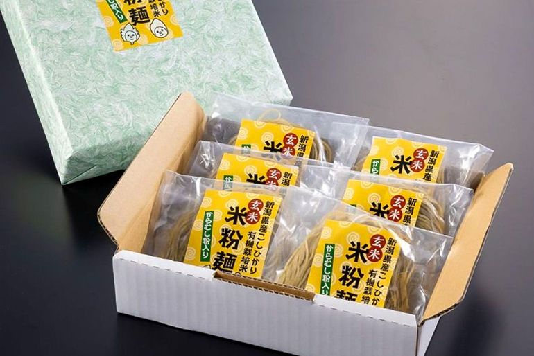 十日町市で、1999(平成11)年に創業した「ネオ昭和」。多年草「からむし」を栽培し、商品開発を手掛ける会社だ。「からむし」はイラクサ科の多年草で、縄文時代から日本人の衣生活を支えてきた伝統的な繊維植物。別名「苧麻(ちょま)」とも呼ばれている。活用するのは、茎の内側にある繊維。これを丹念に糸へと加工し、衣類を製作する。国の重要有形民俗文化財に指定されている越後縮(えちごちぢみ)の原料としても知られ、江戸時代以前より越後の地で脈々と受け継がれてきた。ネオ昭和では、衣類や生活雑貨以外にも「からむしの葉」を粉末にして練り込んだ「からむし麺」や「玄米 米粉麺」などの食品を積極的に開発している。「捨てられる葉の部分も有効活用できないかと考えたのがきっかけでした」と、代表の村山好明さんは語る。からむし麺は、葉に含まれる粘りが生む力強い歯ごたえと、のど越しの良さが好評だ。
