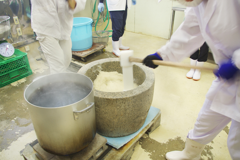 坂井ファームクリエイトでは、小松菜をはじめとする農作物の生産のほか、加工品の製造も手掛ける。中でも力を入れているのが、一年のうち11〜12月にのみ製造する「手つき餅」だ。「施設園芸が盛んな地域なので、跡取りとなる若手の農家が多いんですよね。秋の出荷が終わって仕事が落ち着く時期に、力自慢の若手が集まって、餅つきを始めたのがきっかけです」と、坂井さんは語る。使用するもち米は、有機質肥料を与えて育てた自家栽培の「こがねもち」。セイロでじっくりと蒸したら、杵と臼を使う伝統的な製法で、丁寧につき上げていく。「体力が求められる大変な仕事ですが、機械化が進む今の時代に、昔ながらのお餅を食べてほしい。昔は各家庭で行われていた、もちつきの文化を守っていきたいという想いがあります」手間暇かけて作られた餅は、粘りの強さと豊かな米の香りが評判。冬の人気商品となっている。