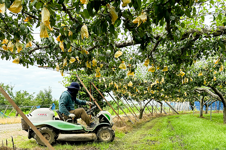 栽培のこだわりの一つが、「袋がけ」。果実一つ一つに手作業で袋を被せる、手間のかかる作業です。袋の止め口を固く縛り、その際に葉っぱが入り込まないようにすることが大事。「止め口が緩いと、雨水が入り込んで果実の色を汚してしまうので、とても大事な作業なんですよ」と、代表の小日向さん。この丁寧な作業が、ル・レクチェの美しい見た目と品質を守っています。