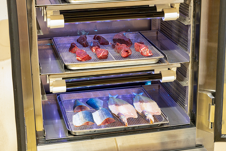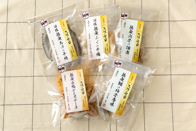 for SMiLE labでは、調理機器を取り扱う「食事業」にも注力。2021年には、八戸工業大学の研究技術を応用した、光熟成調理器を開発した。「食材に紫外線を照射して熟成させる技術『UV-A照射乾燥法』で特許を取得している大学を知り、足を運んだのが開発のきっかけです」と、山田さん。野菜や果物に限定されていた従来品に対し、肉や魚にも対応できるものを開発した。「それぞれの食材に合わせて、紫外線や風の当て方、温度などを調整できます。分かりやすく言うと、天日干しを再現できる機械ですね。天日干しした食材のように、旨味が凝縮されて、保存性が向上します」と語る。この光熟成調理器を活用した惣菜シリーズが「天使の食卓」。レシピ考案や製造は、燕市の割烹料理店「馳走 十二分家」が担当している。光熟成をすることで旨味を凝縮し、素材を活かしたやさしい味わいの料理を完成させた。「食卓に笑顔を届ける」をコンセプトに、光熟成の魅力を発信する。