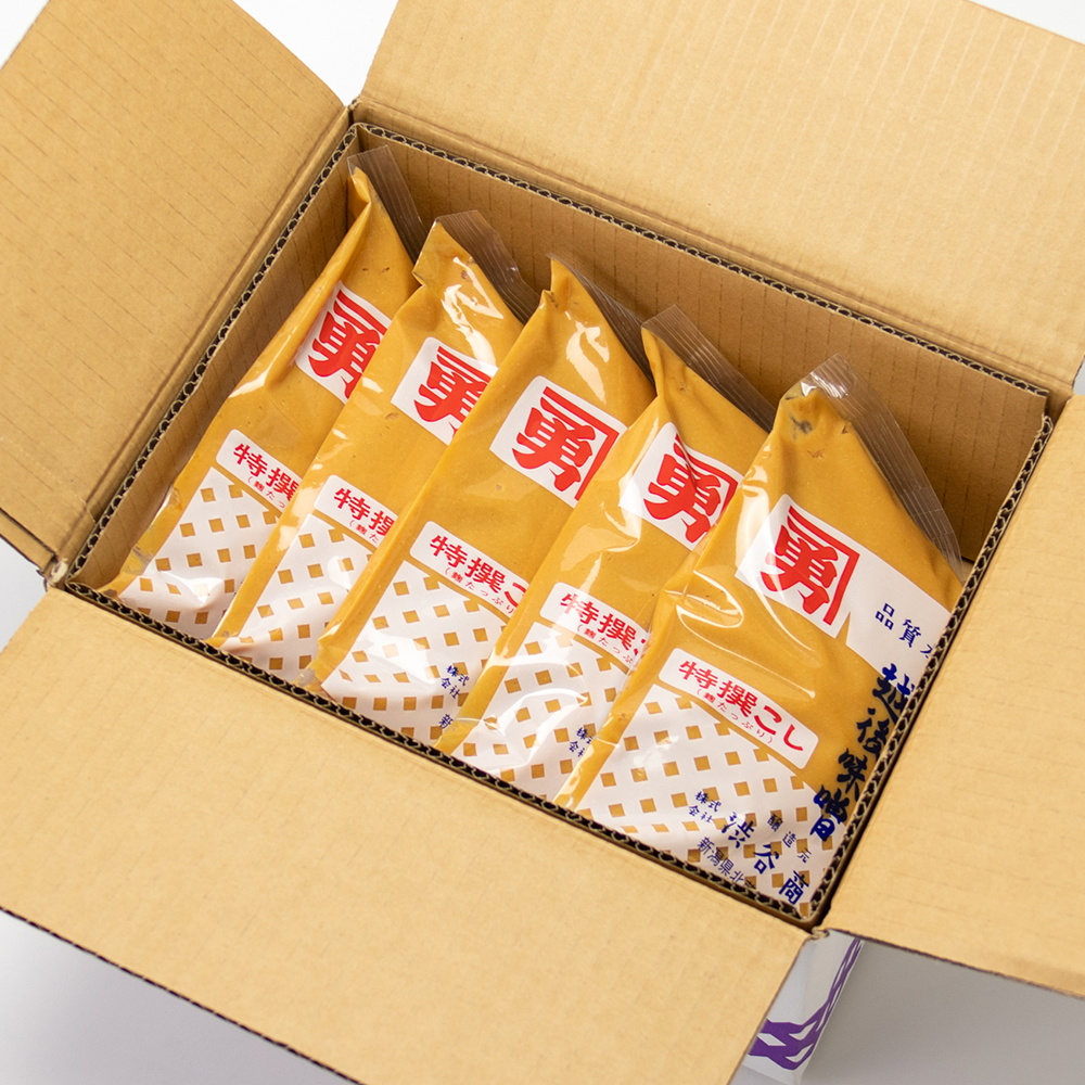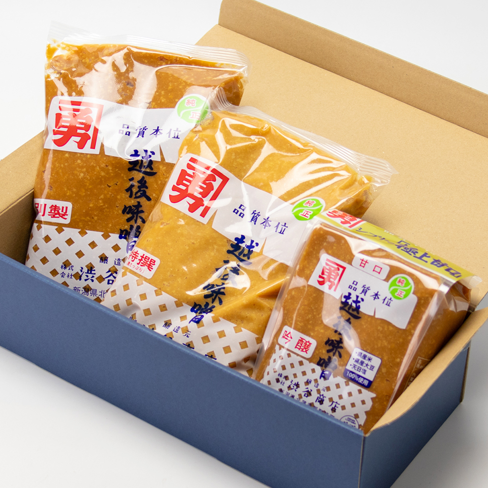 毎日の味噌汁にぴったりな、やさしい味わいが自慢の「渋谷みそ」。新潟県産米で仕込んだ麹と、じっくりと時間をかけて煮た大豆が味の決め手です。今回は、別製・特撰・吟醸の3種類をラインナップしました。