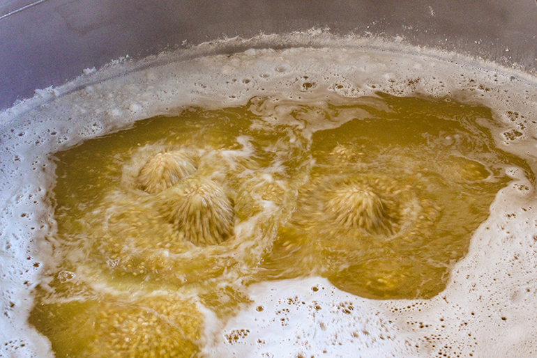 大豆は圧力釜を使わず、水からじっくりと時間をかけて煮るのがこだわり。ひと晩浸漬させた大豆を、朝6時頃からコトコト煮ていきます。大豆の種類や季節に合わせて煮る時間を調整して、丁寧に仕上げていきます。圧力釜に比べて時間はかかりますが、大豆本来の旨味を引き出せるそうです。