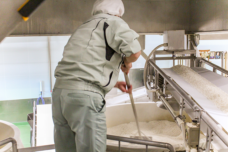 麹の原料となる米を蒸す工程は、「抜け掛け法(ぬけがけほう)」という昔ながらの製法で行います。大型の蒸し器の底に少量の米を敷いて蒸し、蒸気が抜けたらまた少量の米を重ねていきます。2時間ほどこの作業を繰り返し、さらに1時間じっくりと蒸し上げます。米全体をムラなく蒸すことができ、質の良い麹が出来上がるそうです。