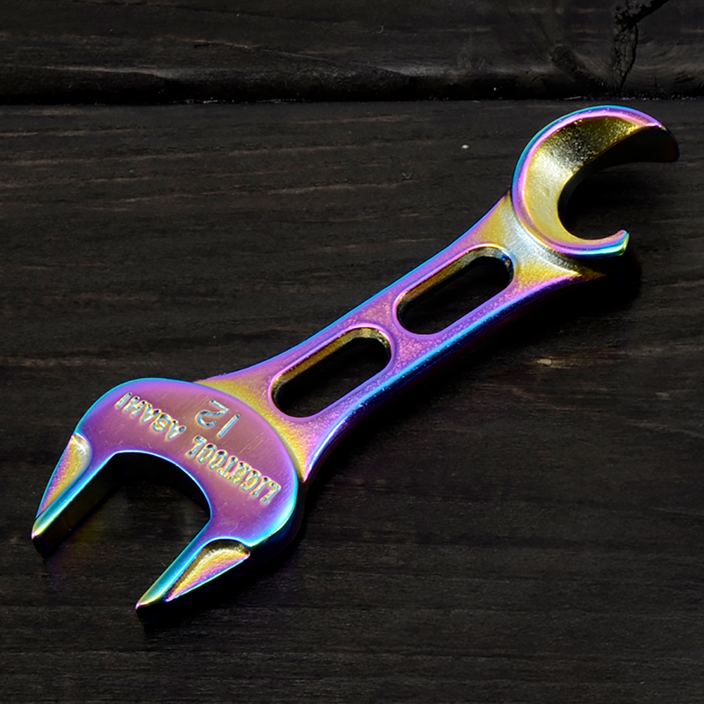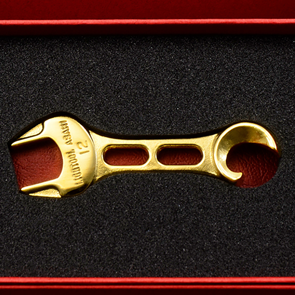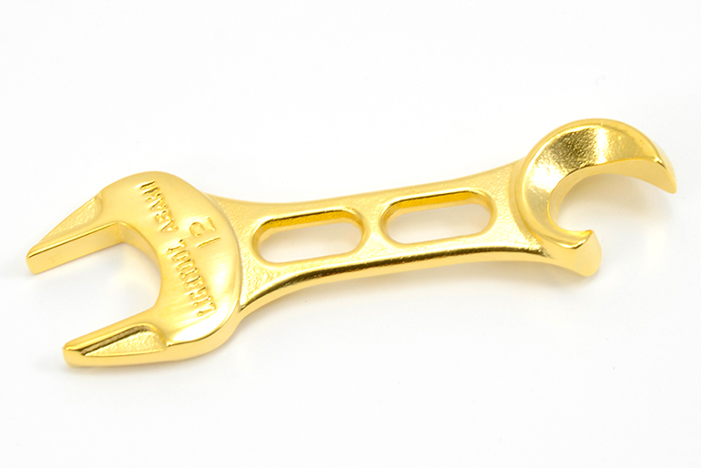 表面に純金メッキを施した、高級感のあるカラー。丁寧な研磨とメッキ加工で、金属の質感を引き立てました。栓抜き以外にも、一部のバイクミラーの調整にも使えるため、ツーリング時にも役立ちます!