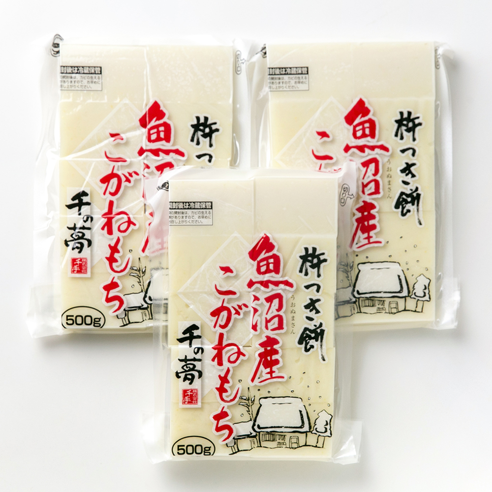 「魚沼産コシヒカリ」の産地として知られる、十日町市川西地域の農業法人「千手」から、自社栽培のもち米を使った「杵つき餅」をご紹介。特別栽培米と同じ基準で育てた「こがねもち」を、丹念につき上げました。きめ細かく、コシのある食感で、噛むほどにお米の旨味を感じられますよ。