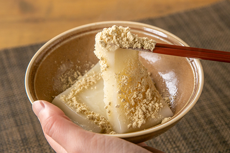 箸でお餅を持ち上げると、ずっしりと弾力のある質感。まったく煮崩れていませんね~。ぱくり……。伸びが良い上に、歯切れも良いです。コシが強く、噛むほどにお米の甘みが広がります。きな粉の香ばしさともよく合いますね!