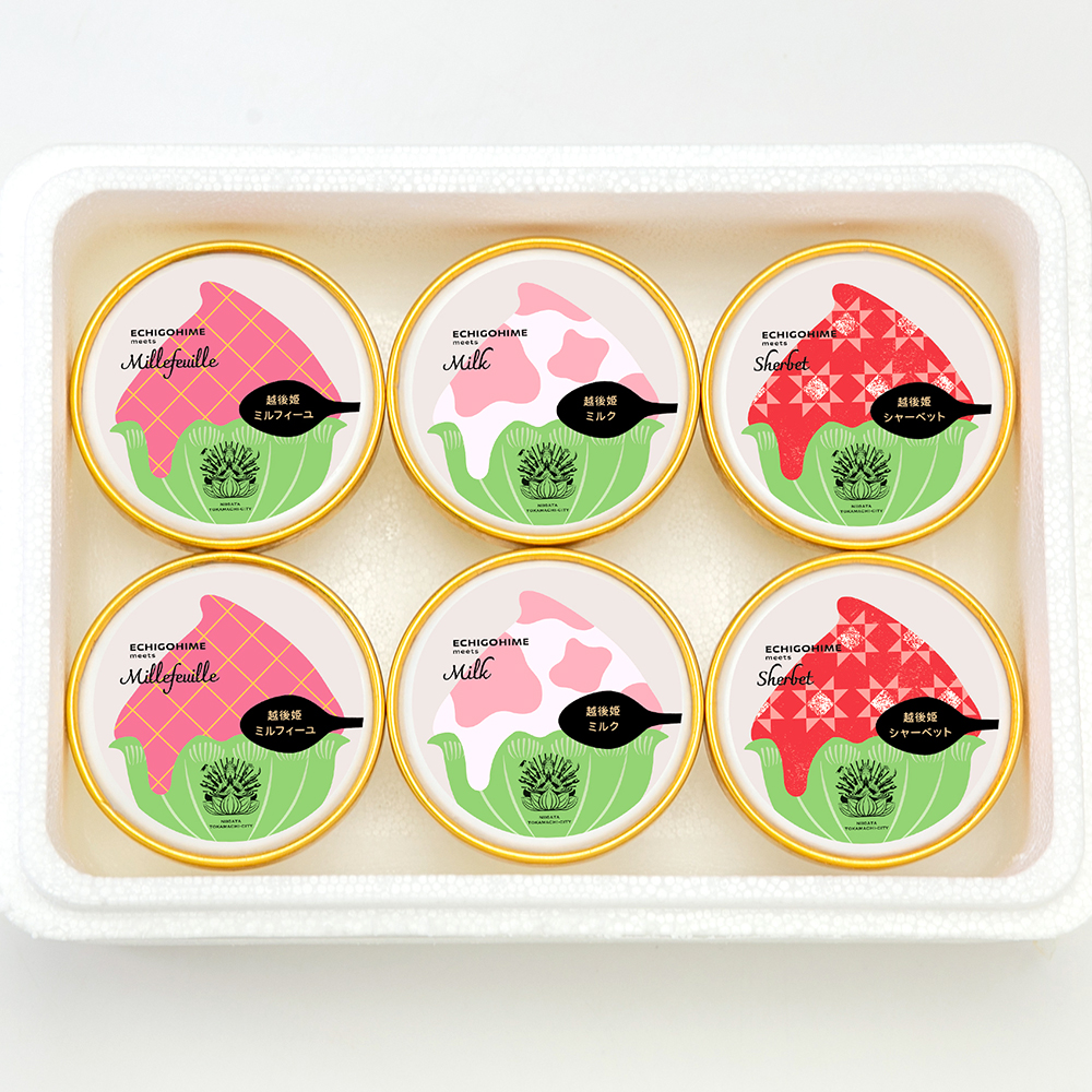 甘酸っぱくてジューシーな味わいが魅力の、新潟が誇るブランドいちご「越後姫」を贅沢に使用。個性豊かな3種類のアイスをご用意しました。可愛らしいパッケージで、ちょっとしたギフトにも喜ばれます。