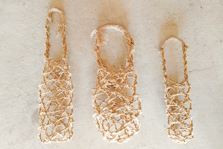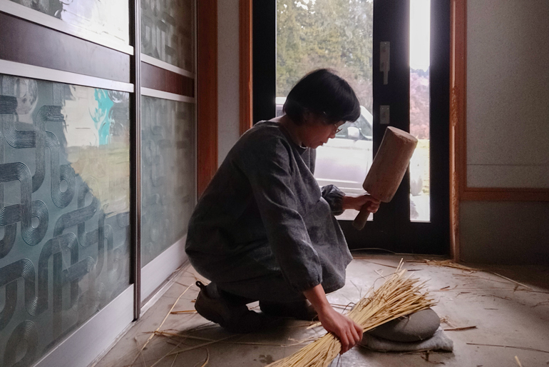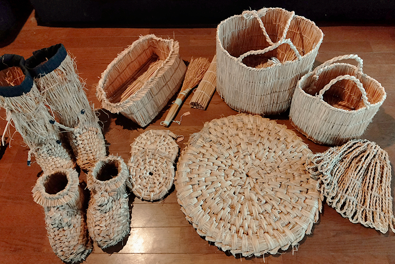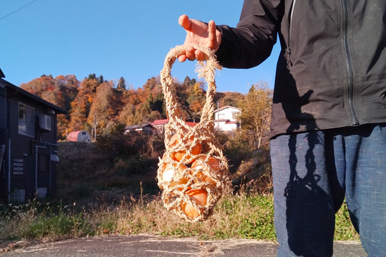 加藤さんが取り組んでいる「わら細工」は、雪国で古くから受け継がれてきた農家の冬仕事。深い雪に閉ざされる冬の期間は、田畑で農作業をすることができないため、家の中で1年分のわら細工を作って暮らしていたそうだ。「プラスチックがない時代は、ほとんどの日用品を『わら』で作っていました。そんな暮らしをしている人は少なくなってしまいましたが、地域のじいちゃん・ばあちゃんに昔話を聞きながら、できることを実践しています」と、加藤さんは語る。わら細工に使用するのは、農薬や化学肥料に頼らず、自分たちで大切に育てた稲わら。収穫後、はざかけで乾燥させてから、きれいなわらを厳選して、わら細工に加工する。例えば、「わらかご」を1つ作るのにかかる時間は約5時間。わらを木づちで叩いてやわらかくし、少しずつねじり合わせながら丈夫な縄にする「縄ない」は、とても根気のいる作業だ。丁寧な手仕事から生まれた日用品は、使い勝手の良さはもちろん、暮らしに馴染む美しさと温もりを持つものばかり。使い込むほどに味が生まれ、愛着が湧いてくるのも、わら細工の魅力のひとつだ。