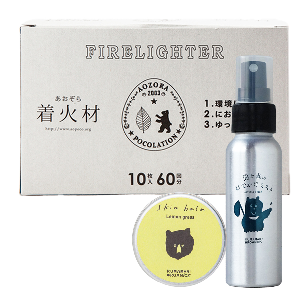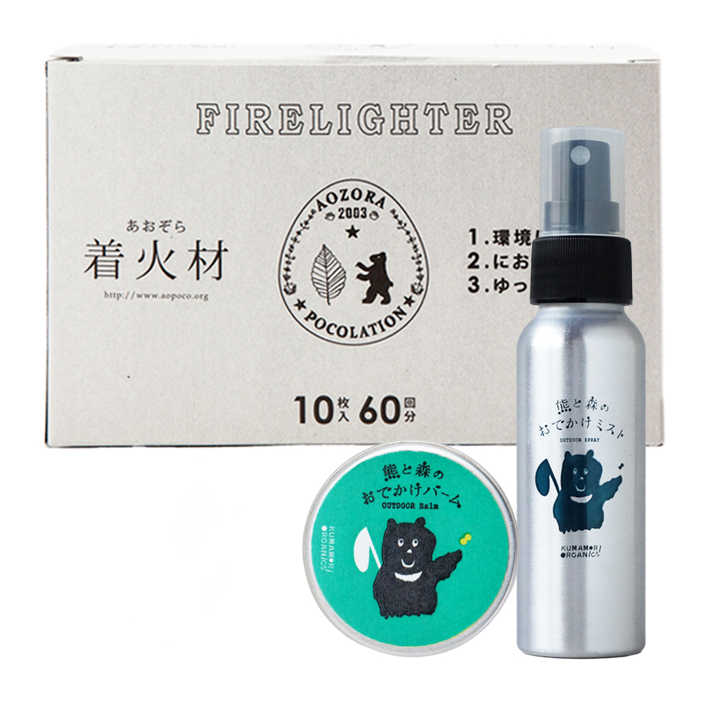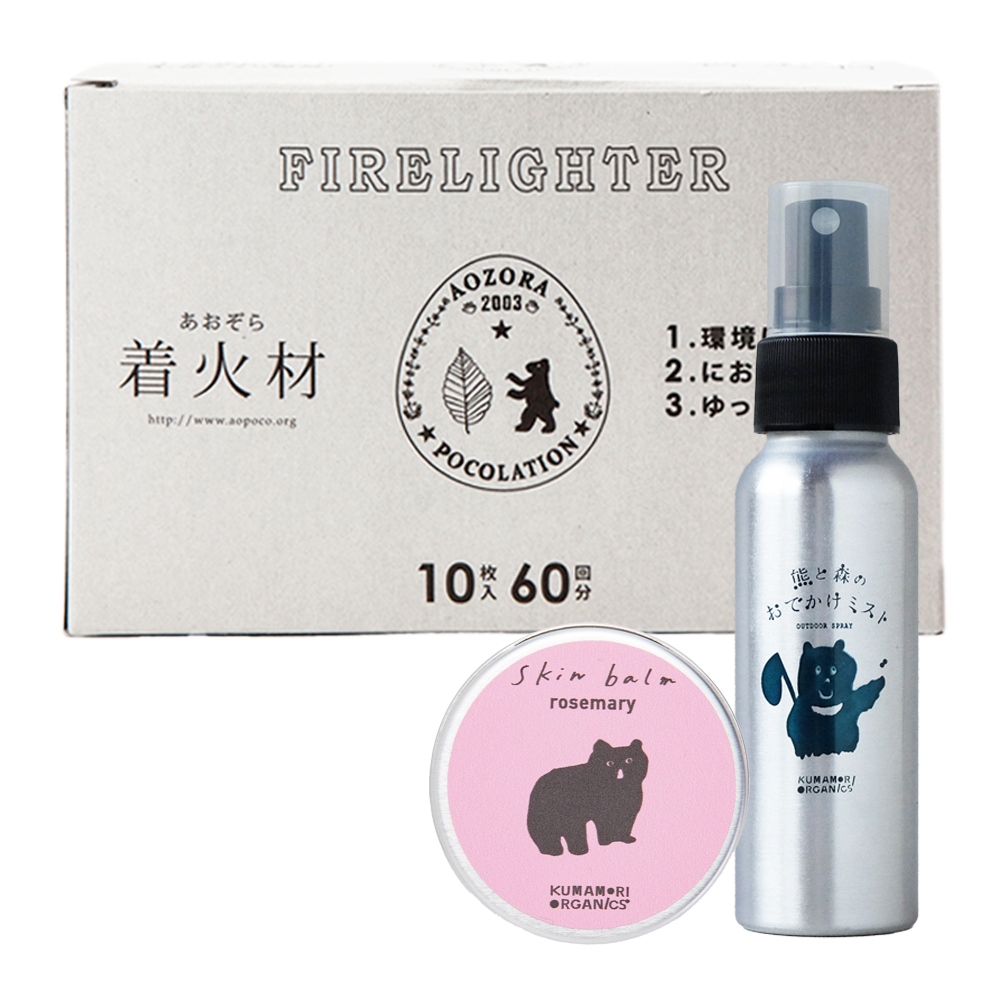 | 内容量 | バーム:15g 熊と森のおでかけミスト:80ml あおぞら着火材:10シート×6袋 |