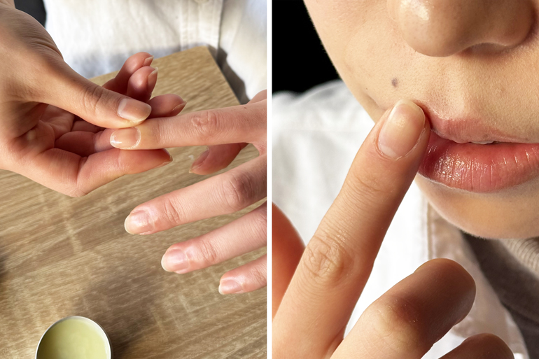 まずは、特に寒い季節に荒れがちな爪まわりです。適量を指で取って、マッサージするように塗り込んでいきます。わぁ〜、ハーブのやさしい香り。とても癒されます。ベタつきが少なくて、使いやすいです。しっとりスベスベに仕上がりました。次は、乾燥しやすい唇。同じくやさしく塗り込んでいくと、だんだん潤いが出てきました。自然と肌に馴染む、ナチュラルな着け心地ですね〜。