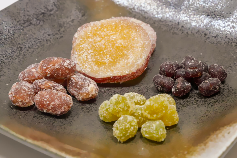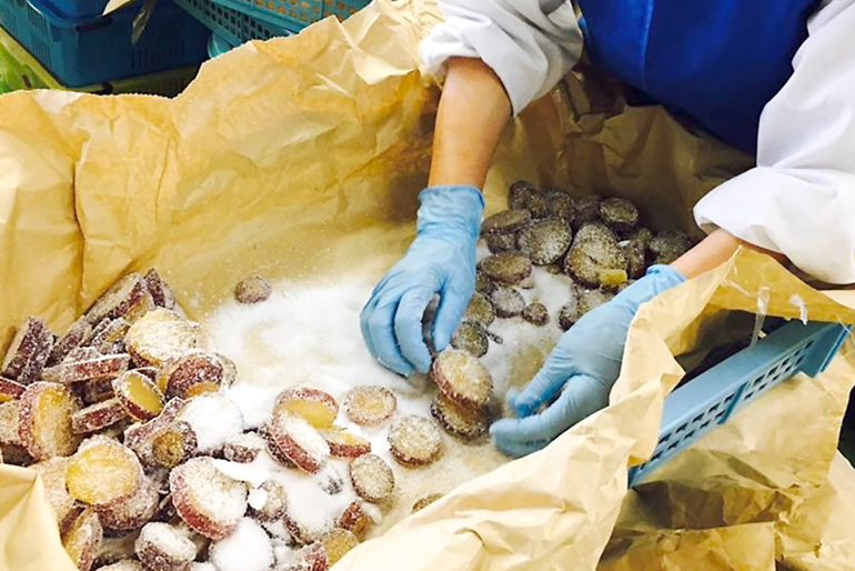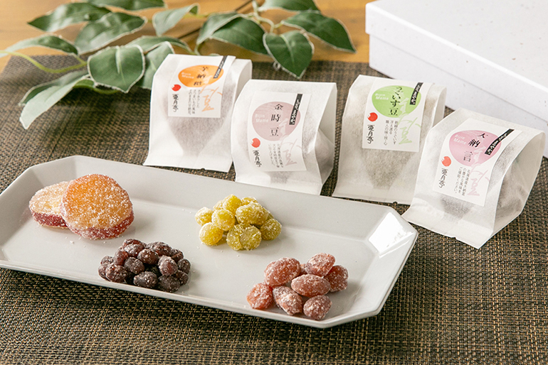 「宮野食品工業所」が手掛ける数ある和菓子の中でも、不動の看板商品が「甘納豆」だ。その誕生は、近隣企業から寄せられた「アイス用の小豆を作れないか」という相談がきっかけだった。当初はアイスクリーム専用の「小豆の蜜漬け」から始まり、その技術を応用して「練り餡」、さらには「煮豆」や「甘納豆」の製造へと豆加工の可能性を広げ、深めてきた。この「甘納豆」は、大納言や金時豆、うぐいす豆など種類も豊富。製法のこだわりは、豆本来の風味を引き出す丁寧な味作りにある。蜜に漬け込む作業では、一気に糖度を上げてしまうと豆は硬くなってしまうため、段階的にゆっくりと甘さを染み込ませていく。さらに豆ごとに火の入り方や甘みの含ませ方を細かく調整。この繊細な工程こそが、外はふっくら、中はしっとりとした絶妙な食感を生む熟練の技だ。それぞれの豆が持つ風味と食感を活かした逸品に仕上げている。