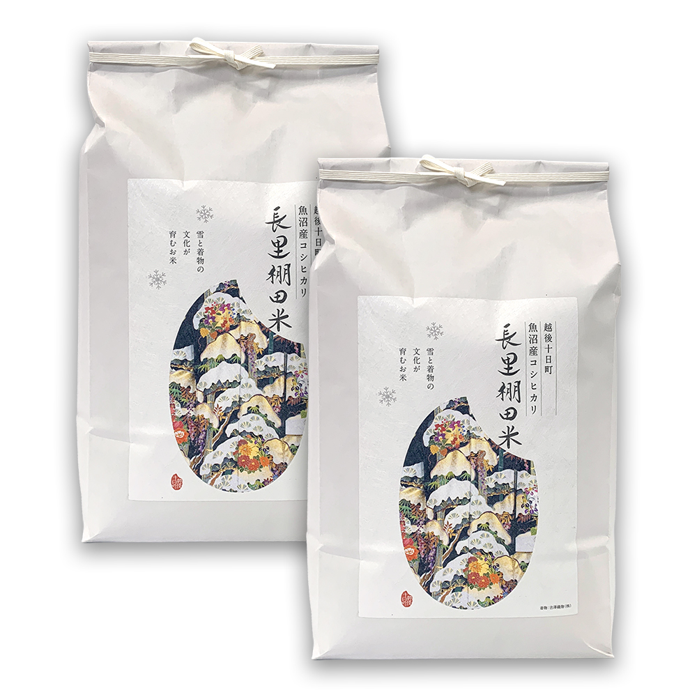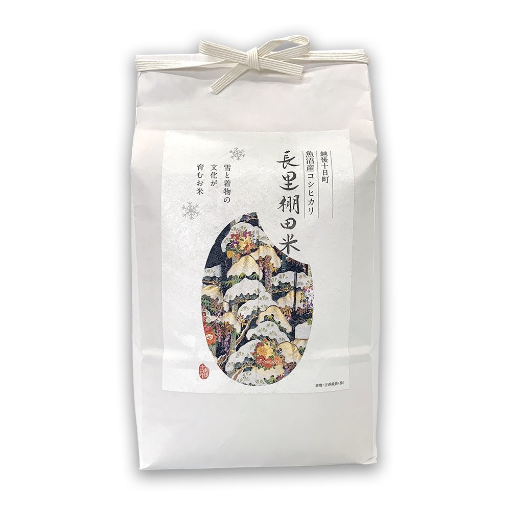 十日町市の長里地区。ここで栽培される「長里棚田米」は、魚沼ブランドの中でも際立った存在感を放っています。広大な平野部とは異なり、一枚一枚が独立した棚田での栽培は、大型機械が入りにくく非常に手間がかかります。しかし、村山土建のスタッフが丁寧に目を配ることで、一粒一粒に栄養が行き渡る理想的な環境を実現しました。パッケージには地場産業である吉澤織物(株)の着物のデザインが施されています。