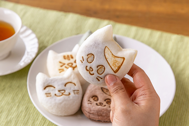 ネコの顔の形と表情がキュート 県産米粉を使用した、もちもち食感が特徴