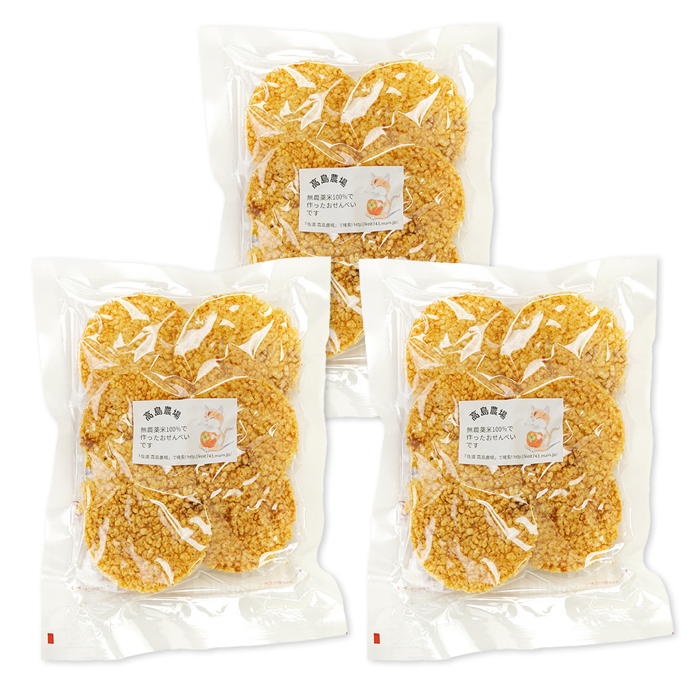 佐渡市の農家・高島農場が手掛ける「おこげせんべい」。使用するお米は、農薬や化学肥料を使わずに育てた自家栽培のものだけ。お米本来の甘みを活かすため、醤油やみりんなどシンプルな調味料で、やさしい味わいに仕上げています。サクッと軽やかな食感と相まって、癖になる美味しさです。スープにトッピングするのもおすすめ!