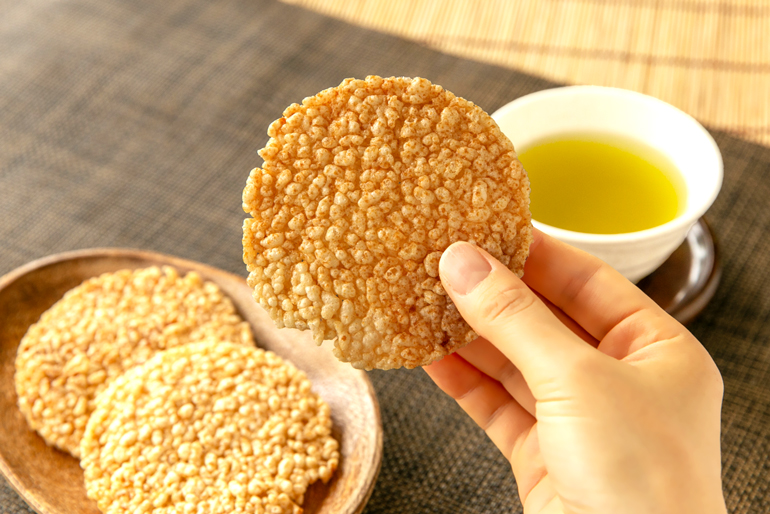 いただきま〜す……。サクッ!おぉ!とても軽くて香ばしい!噛むほどにお米のやさしい甘みが広がります。ほんのりとした甘じょっぱい醤油味が、お米の美味しさを一層引き立てていますよ。温かい緑茶の柔らかな渋みに、よく合います。う〜ん、ほっとしますね。